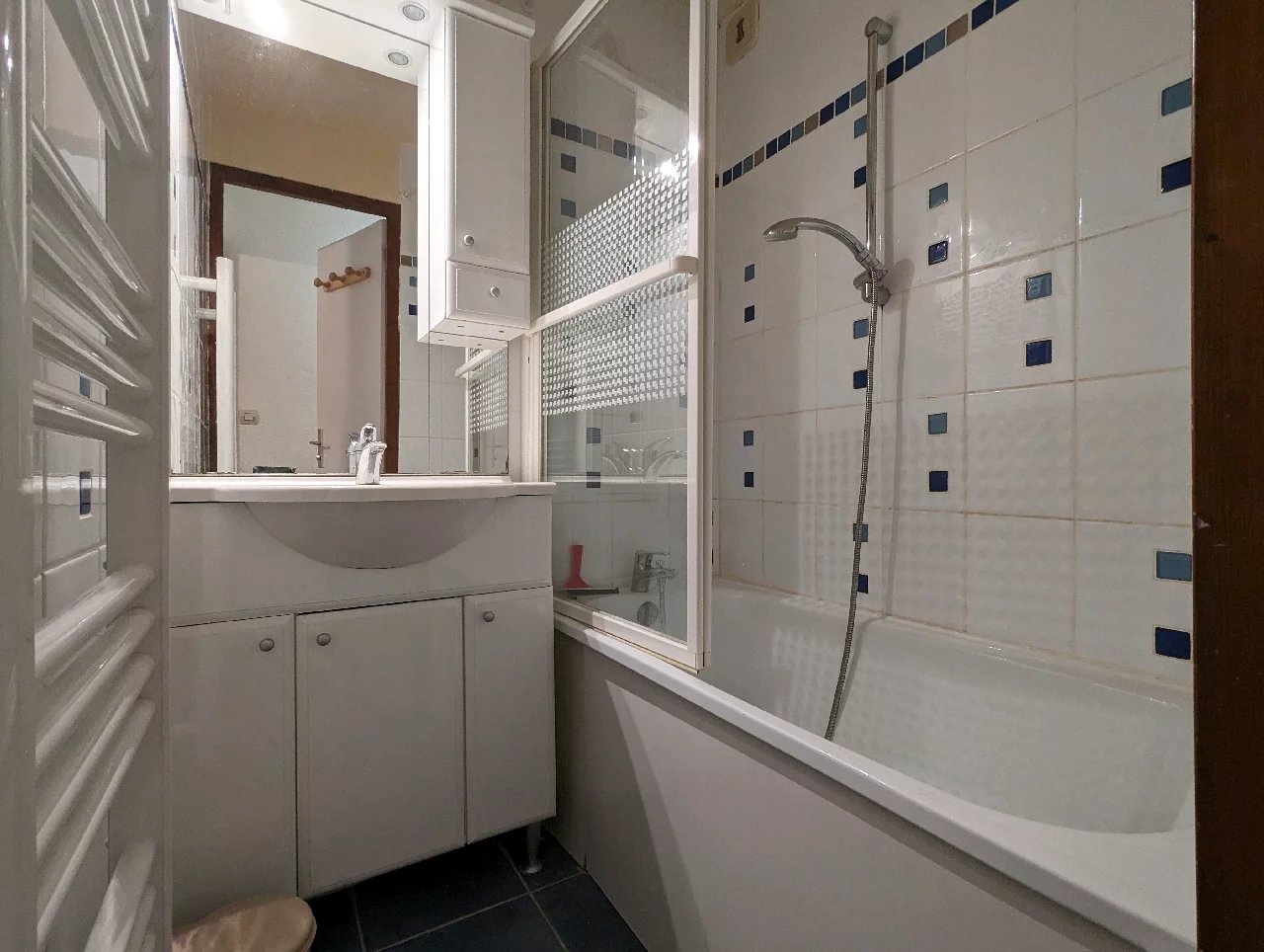 At the ground floor there is an entrance with bunk beds, cupboard, separate wcs, bathroom. The living room with access to the South West facing terrace, kitchenette and a double bedroom with cupboard.This apartment will be sold furnished, with a ski locker and a cave.