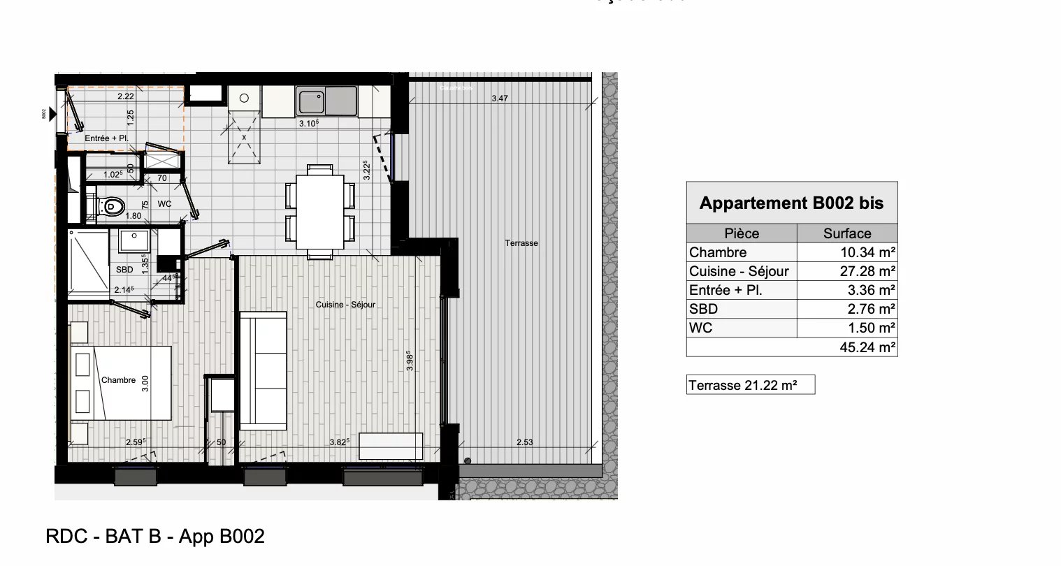 Ce charmant appartement en rez-de-chaussée de 45,24 m² se compose d’une chambre, d’une salle de douche, de WC indépendants, de rangements, et d’un bel espace de vie ouvrant sur une vaste terrasse.
